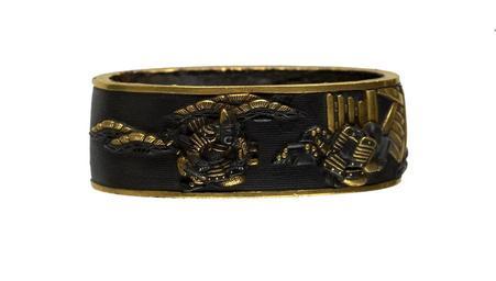 | Keywords: Japanese - Fuchi with Two Samurai - Walters 5112543A.jpg Two samurai dressed in armor are depicted kneeling at the foot of a short set of stairs They may be kneeling before their lord who is depicted on the matching kashira This is part of a mounted set century 18 19 Edo shakudo gold sentoku silver cm 3 8 accession number 51 1254 3A 10190 Henry Walters Baltimore date and mode of acquisition unknown Walters Art Museum Henry Walters Acquired by Henry Walters none place of origin Japan Walters Art Museum license Tosogu Japanese sword fittings in the Walters Art Museum Media contributed by the Walters Art Museum needs category review |