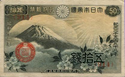 | View Original: | Japanese government small-face-value paper money 50 Sen (Fuji-Sakura) - front.jpg (2464x1512) | |||