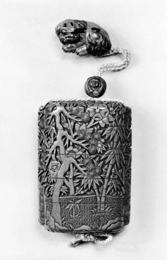 Keywords: Japanese - Inro with the Three Friends of Winter (Pine, Bamboo, and Prunus) - Walters 67538.jpg A standard oblong tsuishu lacquer four compartment inro A design of pine bamboo and prunus in tsuishu carving on a red ground The lower section of the inro with a diaper pattern of asanoha The interior in nashiji and fundame The cord channels are external Together with a lacquered wood carved netsuke in the shape of a seated shishi inu century 19 Edo; Meiji red lacquer wood silver inro cm 8 5 6 2 8 accession number 67 538 7713 William T / Henry Walters Collection Baltimore date and mode of acquisition unknown Walters Art Museum Henry Walters Acquired by William T or Henry Walters none Netsuke Miniature Sculpture of Japan place of origin Japan Walters Art Museum license Netsuke Miniature Sculpture of Japan Inro in the Walters Art Museum Bamboo in art Pines in art Prunus in art Three friends of winter |