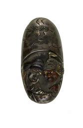 | Keywords: Japanese - Kashira with Two Figures Reading a Scroll - Walters 511045.jpg A warrior and a second figure are shown looking at a scroll The warrior points to the scroll with his left hand This may be the 2nd-century Chinese General Kanyu Ch Guan Yu Kuan Yu Above the figures is a pine tree This is part of a set with Walters 51 1044 century 19 silver gold copper cm 3 4 accession number 51 1045 8053 William T / Henry Walters Collection Baltimore date and mode of acquisition unknown Walters Art Museum Henry Walters Acquired by William T or Henry Walters none place of origin Japan Walters Art Museum license Kashira in the Walters Art Museum Media contributed by the Walters Art Museum needs category review |