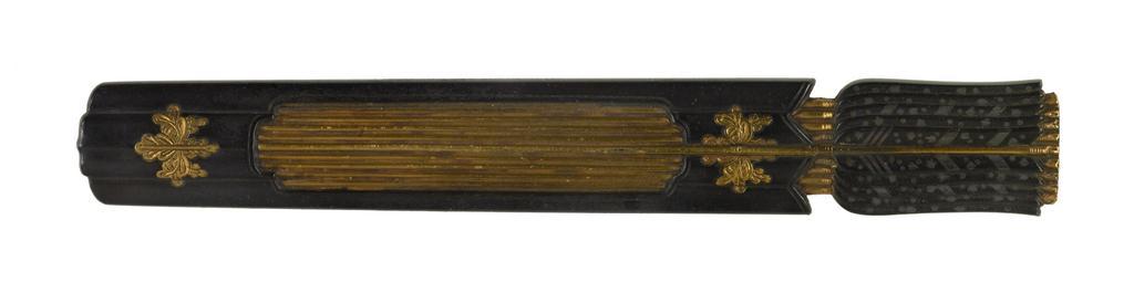 | Keywords: Japanese - Kozuka in the Shape of a Quiver - Walters 51744.jpg This kozuka is designed in the shape of a quiver with arrows A paulownia crest decorates the top and bottom of the quiver century 18 19 shakudo gold silver cm 9 6 accession number 51 744 23940 Henry Walters Baltimore date and mode of acquisition unknown Walters Art Museum Henry Walters Acquired by Henry Walters none place of origin Japan Walters Art Museum license Kozuka in the Walters Art Museum Media contributed by the Walters Art Museum needs category review |