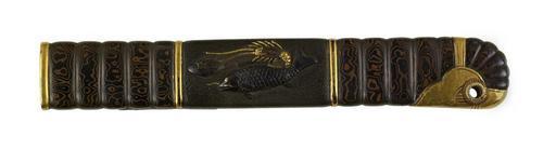 | Keywords: Japanese - Kozuka with Two Fish and a Spiny Lobster - Walters 51679.jpg In the middle section of the kozuka are a catfish a flounder and a spiny lobster On either side are five bands with a wood grain patterning The end of the handle is in the shape of a lobster tail The back of the kozuka has a wood grain pattern date shakudo gold cm 9 6 accession number 51 679 40069 Henry Walters Baltimore date and mode of acquisition unknown Walters Art Museum Henry Walters Acquired by Henry Walters none Sticker - edged with a blue trellis pattern 686 place of origin Japan Walters Art Museum license Kozuka in the Walters Art Museum Catfish in art Media contributed by the Walters Art Museum needs category review |