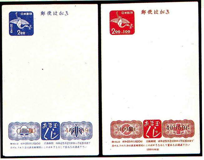 | Keywords: Japanese New year post card in 1949.JPG en Japanese New_year_post_card in 1949 ja 昭和25年用お年玉付き年 葉書として1949年に発行された官製はがき 左側は2円葉書 右側は寄附金1円付きの葉書 小冊子 郵便切手の歩み 日 国郵政 1998年より転載 Japan Post 1949 Scan by Carpkazu PD-Japan 1949 in Japan Government printed postcard of Japan Lottery of Japan Numbering Blue with red |