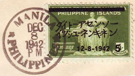| Keywords: Japanese Overprint of US Phillipine Islands Stamp 1942.jpg 5 Centavo overprint on 4 Centavo United States of America Philippine Islands 1935 Agriculture issue Woman and Carabao statue postage stamp overprinted under Japanese occupation commemorating the First Anniversary of the Great East Asia War Postmark MANILA PHILIPPINES DEC 8 1942 PM <small> CDS </small> Base stamp 4c Agriculture issue of 1935 <small> yellow green </small> Overprint in black First Anniversary Greater East Asia War <small> in Japanese </small> with date 12-8-1942 and value 5 <small> over 4 Centavos </small>; Deleting bar at top to obliterate United States of America <small>NOTE Although the Japanese attack on Pearl Harbor took place on the morning of Sunday December 7 1941 Hawaiian time as Japan is West of the International Date Line it was Monday there thus making December 8 1942 the correct date in Asia to observe the first anniversary of the start of the War </small> The Cooper Collection of Postal History <small> Private collection </small> 1935 <small> Original issue </small>; December 8 1942 <small> overprint </small> Bureau of Engraving and Printing Washington DC <small> Base stamp </small>; Bureau of Printing Manila <small> overprint </small> PD-USGov Original upload log en wikipedia Japanese+Overprint+of+US+Phillipine+Islands+Stamp+1942 jpg wikitable - 2009-06-12 11 26 901×508× 506952 bytes Centpacrr stamp Uncategorized 2016 June 25 |