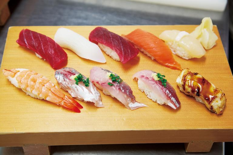 Keywords: Japan sushi roll dish fish food plate bamboo seafood raw