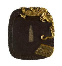 | Keywords: Japanese - Tsuba in the Shape of an Inkstone with Inkstick - Walters 51411.jpg This tsuba has a raised rim that gives it the appearance of an inkstone The upper right is decorated with a dragon At the lower right is an inkstick decorated with a phoenix Rather than purchasing liquid ink ready to use individuals would make their own ink by grinding an inkstick in an inkstone to which a little water had been added Only enough of the stone would be ground to create ink for the immediate use On the reverse of the tsuba are peacock feathers decorated with gold enamel The central opening for the blade has been plugged This tsuba appears to be unused date Edo-Meiji iron silver gold cm 7 9 accession number 51 411 1476 Henry Walters Baltimore date and mode of acquisition unknown Walters Art Museum Henry Walters Acquired by Henry Walters none place of origin Japan Walters Art Museum license Tsuba in the Walters Art Museum Media contributed by the Walters Art Museum needs category review |