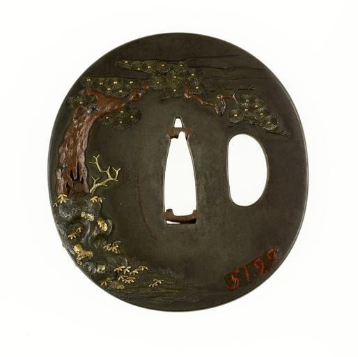Keywords: Japanese - Tsuba with Bishamonten - Walters 5199 - Back.jpg In the Buddhist pantheon Bishamonten is the chief of the four Guardian Kings who guard the cardinal directions He protects the north and is shown holding a lance and a small pagoda The pagoda symbolizes a treasure house of spiritual wealth that he protects He also appears as one of the seven gods of good fortune in folk beliefs In that context he is considered the god of warriors This makes him a particularly appropriate decoration for a tsuba The reverse shows a pine tree which is also considered a sign of good fortune The branches from this pine tree appear along the upper border of the front side as well century 19 shibuichi gold copper cm 6 55 6 1 0 22 accession number 51 99 17841 Henry Walters Baltimore date and mode of acquisition unknown Walters Art Museum Henry Walters Acquired by Henry Walters none place of origin Japan Walters Art Museum license Tsuba in the Walters Art Museum Media contributed by the Walters Art Museum needs category review |