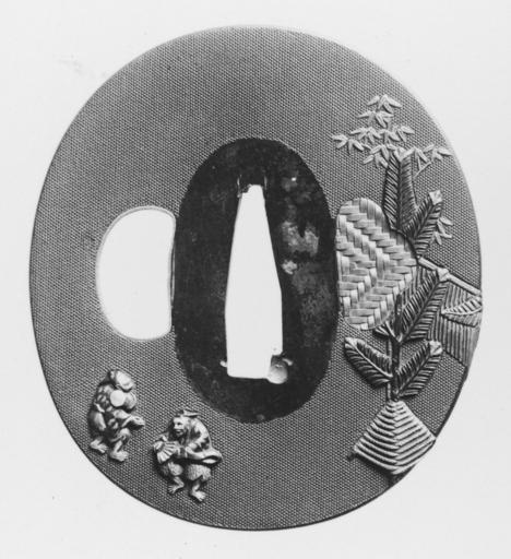 | Keywords: Japanese - Tsuba with Dancers Celebrating New Year - Walters 51241.jpg The pine tree and bamboo decorations on the right side of the tsuba are part of traditional New Year's decorations Both pine and bamboo are considered felicitous Behind the pine a rope decorated with hanging straw pendants wraps around the edge of the tsuba to the reverse side At the lower left on the front are two small figures performing a manzai dance to celebrate the New Year One beats a small drum while the other dances with a fan Both wear masks The back shows the reverse side of the decorations which appear on the front Note the unusual basket weave design on the metal plugging the hole for the hair pick on the right date shakudo gold copper cm 6 4 5 8 0 36 accession number 51 241 6886 Henry Walters Baltimore date and mode of acquisition unknown Walters Art Museum Henry Walters Acquired by Henry Walters none place of origin Japan Walters Art Museum license Tsuba in the Walters Art Museum Reliefs of dancers on Japanese sword fittings Media contributed by the Walters Art Museum needs category review Manzai comedy |