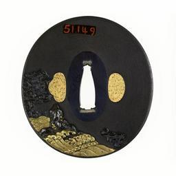 | Keywords: Japanese - Tsuba with the Dragon King's Gifts to Hidesato - Walters 51149 - Back.jpg This tsuba shows attendants of the Dragon King carrying gifts of gratitude to Fujiwara no Hidesato The Dragon King asked Hidesato to kill the giant centipede of Mount Mikami who was poisoning the Dragon King's underwater kingdom Hidesato shot the centipede with an arrow killing it In gratitude the Dragon King gave him a bronze bell a never-ending bolt of silk a pot that cooked food without fire and a limitless bag of rice Because of the rice Hidesato is also known as Tawara Toda Lord of the Rice Bag The bell and the bag of rice can be seen in the waves on the front of this tsuba The back of the tsuba shows waves and rocks before 1931 copper alloy gold shakudo silver cm 7 9 7 3 0 35 accession number 51 149 24604 Henry Walters Baltimore date and mode of acquisition unknown Walters Art Museum Henry Walters Acquired by Henry Walters none place of origin Japan PD-Japan Tsuba in the Walters Art Museum Media contributed by the Walters Art Museum needs category review Dragon Kings |