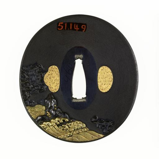 Keywords: Japanese - Tsuba with the Dragon King's Gifts to Hidesato - Walters 51149 - Back.jpg This tsuba shows attendants of the Dragon King carrying gifts of gratitude to Fujiwara no Hidesato The Dragon King asked Hidesato to kill the giant centipede of Mount Mikami who was poisoning the Dragon King's underwater kingdom Hidesato shot the centipede with an arrow killing it In gratitude the Dragon King gave him a bronze bell a never-ending bolt of silk a pot that cooked food without fire and a limitless bag of rice Because of the rice Hidesato is also known as Tawara Toda Lord of the Rice Bag The bell and the bag of rice can be seen in the waves on the front of this tsuba The back of the tsuba shows waves and rocks before 1931 copper alloy gold shakudo silver cm 7 9 7 3 0 35 accession number 51 149 24604 Henry Walters Baltimore date and mode of acquisition unknown Walters Art Museum Henry Walters Acquired by Henry Walters none place of origin Japan PD-Japan Tsuba in the Walters Art Museum Media contributed by the Walters Art Museum needs category review Dragon Kings