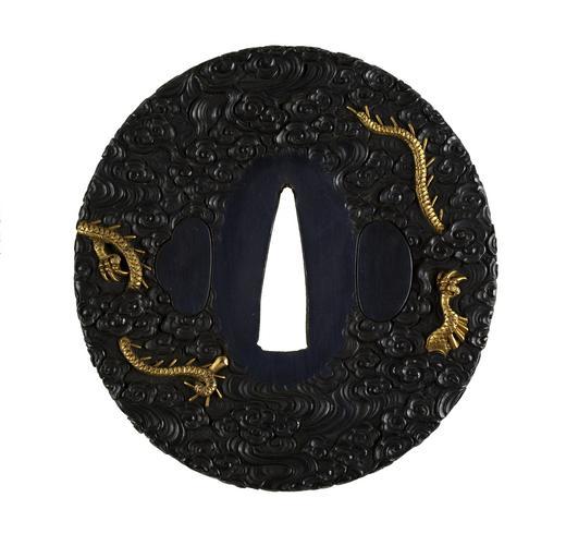 Keywords: Japanese - Tsuba with Dragon - Walters 5112142 - Back.jpg Two gold dragons wrap around the tsuba Their bodies are partially obscured by clouds and can also be seen on the reverse The lower dragon holds a jewel Dragons are often depicted with jewels which are taken from Buddhist belief and also related to the two tide ruling jewels controlled by the Dragon King of the sea This is part of a mounted set between 1868 1912 Meiji gold shakudo cm 7 7 7 3 0 8 accession number 51 1214 2 10278 Henry Walters Baltimore date and mode of acquisition unknown Walters Art Museum Henry Walters Acquired by Henry Walters none place of origin Japan Walters Art Museum license Tsuba in the Walters Art Museum Media contributed by the Walters Art Museum needs category review |