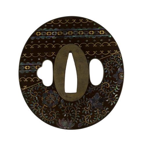 Keywords: Japanese - Tsuba with Floral Design of Overlapping Textiles ("Ho-o") - Walters 51298 - Back.jpg The decoration of this tsuba simulates three panels of overlapping pieces of fabric Along the upper left is a floral design with large flowers interspersed with leaves and smaller flowers On the right is a design of small repeating circles with three larger designs superimposed Along the lower left is a phoenix and paulownia motif late Other date century 19 copper copper alloy lacquer mother of pearl and gold cm 7 4 accession number 51 298 6932 Henry Walters Baltimore date and mode of acquisition unknown Walters Art Museum Henry Walters Acquired by Henry Walters none place of origin Japan Walters Art Museum license Tsuba in the Walters Art Museum Tsuba made with copper Tsuba made with gold |