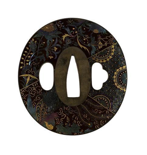 Keywords: Japanese - Tsuba with Floral Design of Overlapping Textiles ("Ho-o") - Walters 51298.jpg The decoration of this tsuba simulates three panels of overlapping pieces of fabric Along the upper left is a floral design with large flowers interspersed with leaves and smaller flowers On the right is a design of small repeating circles with three larger designs superimposed Along the lower left is a phoenix and paulownia motif late Other date century 19 copper copper alloy lacquer mother of pearl and gold cm 7 4 accession number 51 298 6932 Henry Walters Baltimore date and mode of acquisition unknown Walters Art Museum Henry Walters Acquired by Henry Walters none place of origin Japan Walters Art Museum license Tsuba in the Walters Art Museum Media contributed by the Walters Art Museum needs category review |