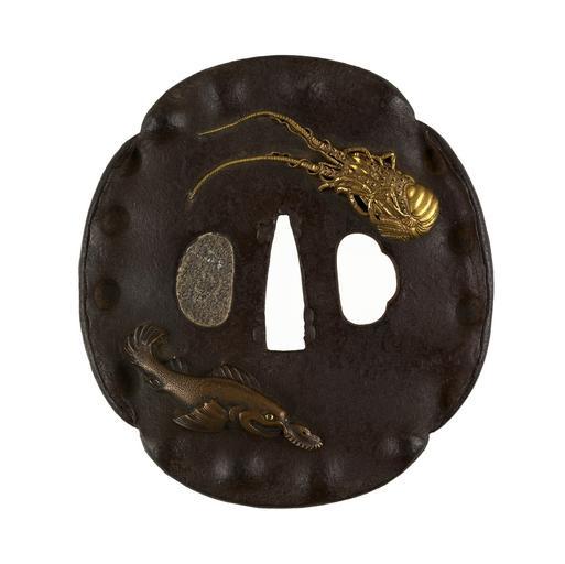 | Keywords: Japanese - Tsuba with Spiny Lobster and Fish - Walters 51321.jpg This tsuba is decorated with two fish and a spiny lobster The lobster is at the upper right on the front A fish is at the lower left On the reverse is a snapper The hole for the utility knife has been plugged date iron gold copper alloy nigurome lead cm 8 8 8 1 0 56 accession number 51 321 40877 Henry Walters Baltimore date and mode of acquisition unknown Walters Art Museum Henry Walters Acquired by Henry Walters none place of origin Japan Walters Art Museum license Tsuba in the Walters Art Museum Media contributed by the Walters Art Museum needs category review |