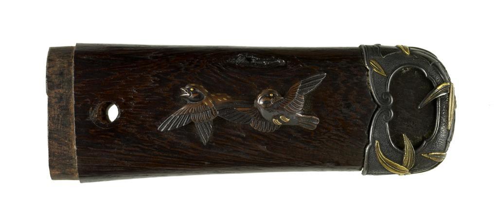 Keywords: Japanese - Tsuka with Bamboo and Birds - Walters 5112762B - Back.jpg The kashira is decorated with gold and silver bamboo leaves The menuki on the front is a large crane The reverse menuki is in the shape of two flying sparrows This is part of a mounted set century 18 19 Edo gold silver wood cm 9 8 accession number 51 1276 2B 79548 Henry Walters Baltimore date and mode of acquisition unknown Walters Art Museum Henry Walters Acquired by Henry Walters none place of origin Japan Walters Art Museum license Tsuka in the Walters Art Museum Media contributed by the Walters Art Museum needs category review |