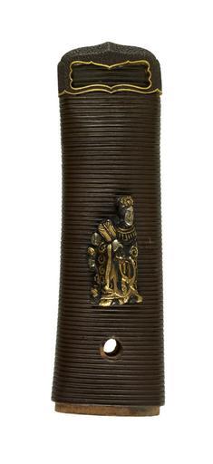 | Keywords: Japanese - Tsuka with Chinese Figures - Walters 5111922b.jpg The two menuki on this tsuka are in the shape of standing Chinese figures On the front is a woman holding a fan She may be the Queen Mother of the West who had an orchard of peaches that granted immortality The figure on the reverse is a man carrying a peach on a tray This is part of a mounted set century 19 Edo-Meiji sentoku gold baleen cm 11 9 accession number 51 1192 2b 79570 Henry Walters Baltimore date and mode of acqisition unknown Walters Art Museum Henry Walters Acquired by Henry Walters none place of origin Japan Walters Art Museum license Tsuka in the Walters Art Museum Media contributed by the Walters Art Museum needs category review |