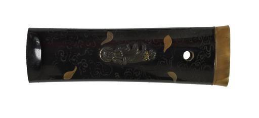 | Keywords: Japanese - Tsuka with Menuki of Buddha and Daruma - Walters 5111493.jpg The body of the tsuka is decorated with clouds and gold lotus petals The petals frame the menuki which represent two important religious figures The first is the historical Buddha known in Japan as Shakyamuni shown descending from his mountain retreat The other menuki depicts Bodhidaruma the founder of Zen Buddhism He rides on a reed crossing the ocean from China to Japan A horn fuchi is attached to the end of the tsuka This is part of a mounted set century 19 horn cm 12 7 accession number 51 1149 3 29781 William T / Henry Walters Collection Baltimore date and mode of acquisition unknown Walters Art Museum Henry Walters Acquired by William T or Henry Walters none place of origin Japan Walters Art Museum license Tsuka in the Walters Art Museum Media contributed by the Walters Art Museum needs category review |