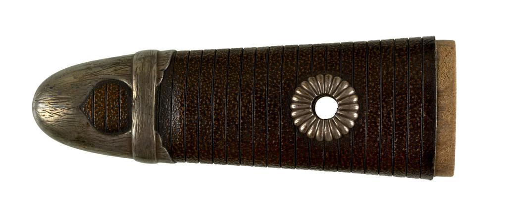 Keywords: Japanese - Tsuka with Silver Metalwork - Walters 5111702B.jpg The lacquer work on the tsuka imitates leather The kashira on the end is decorated with cat scratch engraving neko gake The hole for the mekuki which held the blade in place is surrounded by a lobbed fitting This is part of a mounted set century 19 Edo-Meij red-gold lacquer and gold dust lacquer silver cm 10 4 accession number 51 1170 2B 79562 William T / Henry Walters Collection Baltimore date and mode of acquisition unknown Walters Art Museum Henry Walters Acquired by William T or Henry Walters none place of origin Japan Walters Art Museum license Tsuka in the Walters Art Museum Media contributed by the Walters Art Museum needs category review |