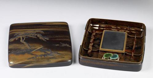 | Keywords: Japanese - Writing Box and Implements (suzuri bako) with a Pheasant Beside a Stream - Walters 6775 - Open A.jpg Implements inside the box A rectangular inkstone with a depression for water is positioned in the center of the box On the right side are brushes and a stylus while on left is an encased knife used to cut paper The enamel piece above in the shape of hollyhock leaves is a water-dropper An ink stick sumi would have been included in the set The sumi is a small stick of solid ink that is turned into usable ink by grinding it on the inkstone and adding water Lid with pheasant beside a stream The inlaid silver Japanese text on the lid is a partial line from a poem in Lady Murasaki Shikibu's early 11th-century novel The Tale of Genji In chapter 29 The Royal Outing the emperor invites Genji to go hunting in the mountains outside Kyoto Genji sends his regrets that he cannot join the royal party The emperor decides to send Genji a couple of pheasants with the following poem attached Deep in the snows of Mount Oshio Are ancient pheasants' tracks Would that you might see them The box makes a poignant reference to this classical poem as it holds the tools of a poet century 18 19 Edo; Meiji box wood lacquer silver mother-of-pearl gold; paint brushes wood lacquer animal hair; water dropper silver enamel; stylus wood lacquer steel; knife wood lacquer steel; ink stone slate Lid cm 2 54 21 27 22 86 ; Bottom cm 3 81 21 27 22 86 accession number 67 75 21270 Henry Walters Baltimore date and mode of acquisition unknown Walters Art Museum Henry Walters Acquired by Henry Walters Japanese Lacquers The Walters Art Gallery Baltimore 1984 place of origin Japan Walters Art Museum license Art of Japan in the Walters Art Museum Suzuri bako |