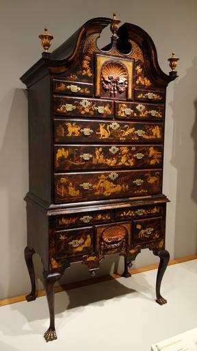Keywords: Japanned high chest, signed in chalk 'Pim', case by John Pimm, Boston, Massachusetts, 1740-1750, soft maple, black walnut, white pine, mahogany, paint, gesso, original brass, view 1 - Winterthur Museum - DSC01398.JPG en Exhibit in the Winterthur Museum New Castle County Delaware USA Photography was permitted in the museum without restriction This work is in the public domain because the artist died more than 70 years ago 2013-05-08 10 54 00 own Daderot cc-zero Furniture in Winterthur Museum Uploaded with UploadWizard American Queen Anne style furniture High chests of drawers |