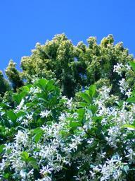 Keywords: jasmine star white flowers thuja tree flowering creeper rustic flora apocynaceae nature blue sky provence france green leaves green branch conifer tree ornament plant flower garden trachelospermum jasminoides