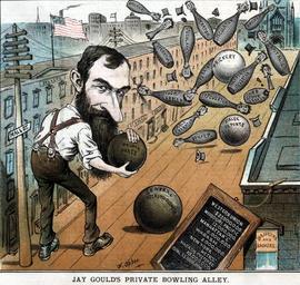 | Keywords: Jay Gould's Private Bowling Alley - Opper 1882.jpg Jay Gould is depicted on Wall Street using bowling balls titled trickery false reports private press and general unscrupulousness to knock down bowling pins labeled as operator broker banker inexperienced investor etc A slate shows Gould's controlling holdings in various corporations including Western Union Missouri Pacific Railroad and the Wabash Railroad Jay Gould's Private Bowling Alley Puck magazine Vol XI No 264 cover ppmsca 28461 Creator Frederick Burr Opper 1882-03-29 PD-old-70-1923 1882 in rail transport in the United States 1880s political cartoons of the United States 1880s magazines Economic history of the United States Frederick Burr Opper Jay Gould Puck magazine Wall Street |