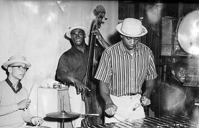 Keywords: Jazz Monitors.jpg en The Jazz Monitors 1957 - from left Roger Dawson drums Herbie Lewis bass Bobby Hutcherson vibraphone Nat Brown piano Own Stephborel 1957-01-05 Roger Dawson Bobby Hutcherson