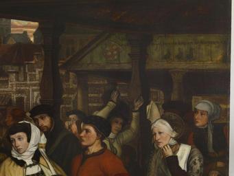 | Keywords: Jean August Hendrik Leys - The Edict-s- of Charles V - Walters 37123 - Detail C.jpg Baron Leys was regarded as Belgium's foremost artist in the mid 19th century About 1851 he adopted a deliberately archaizing style resulting in part from a visit to Germany in 1852 This scene is set in the artist's native Antwerp identifiable because of the famous church spire in the distance Between 1520 and 1550 Charles V emperor of the Holy Roman Empire issued 11 edicts making the practice of Protestantism a crime punishable by death Antwerp served as a major center of learning and finance that had attracted many foreigners especially Jews and Protestants ca 1861 oil on panel cm 138 245 ; Framed cm 182 9 280 7 12 7 accession number 37 123 7985 Comte W de Bourgade date and mode of acquisition unknown Comte de Liedekerke-Beaufort Dinant date and mode of acquisition unknown Charles Deschamps October 24 1883 mode of acquisition unknown William T Walters Baltimore October 1883 by purchase Henry Walters city Baltimore Walters Art Museum Henry Walters Acquired by William T Walters 1883 Label Paper sticker on reverse Exhibition Historique de l'art Belge / Nom de possesseur du tableau Cte W de Bourgade / Subjet de l'oeuvre Publication des edits de Charles Quint / Valeur / Nom de l'auteur Bon Leys Salute to Belgium place of origin Picardy Walters Art Museum license 2D Salute to Belgium The Edicts of Charles V Media contributed by the Walters Art Museum needs category review Paintings in the Walters Art Museum |
