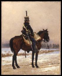 | Keywords: Jean Baptiste Edouard Detaille - The Picket - Walters 3792.jpg Like his teacher J -L -E Meissonier Detaille chose military subjects not only from his own era but also from the reign of Napoleon I 1804-1814 These images recalled the past glories of France In this winter scene set in the Napoleonic era a member of the Eleventh Hussar regiment keeps watch 1875 Oil on canvas cm 46 5 38 ; Framed cm 78 11 69 53 accession number 37 92 15418 William T Walters Baltimore prior to 1878 mode of acquisition unknown Henry Walters city Baltimore Walters Art Museum Henry Walters Acquired by William T Walters before 1878 Signature Lower left EDOUARD DETAILLE; Date Lower left 1875 place of origin France PD-old-auto 1912 Édouard Detaille-Napoleonic Wars Media contributed by the Walters Art Museum needs category review French paintings in the Walters Art Museum 11e régiment de hussards |