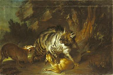 | Keywords: Jean-Baptiste Oudry - Hyena (1739).jpg Artwork Creator Jean-Baptiste Oudry Kampf einer Streifenhyäne gegen zwei Haushunde 1739 oil canvas in 51 1875 74 8125 Staatliches Museum Schwerin accession number object history credit line exhibition history 1 Transferred from http //en wikipedia org en wikipedia; transferred to Commons by User Quadell using http //tools wikimedia de/~magnus/commonshelper php CommonsHelper 2008 06 08 original upload date Original uploader was Dark hyena at http //en wikipedia org <br/>2 http //arttattler com/archiveoudry html PD-old-100 Original upload log page en wikipedia Hyena_fighting_dogs jpg 2008-06-08 22 01 Dark hyena 240×304× 18891 bytes <nowiki> Hyena by Jean-Baptiste Oudry Jean-Baptiste Oudry collection Is of lower resolution than original work To illustrate an aspect of art derived</nowiki> DEFAULTSORT Oudry Jean-Baptiste; Hyena 1739; Staatliches Museum Schwerin Paintings of animals by Jean-Baptiste Oudry Paintings in the Staatliches Museum Schwerin Hyaena hyaena Hyena in art Paintings of mammals |