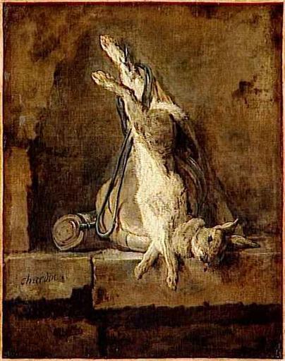| Keywords: Jean-Baptiste Siméon Chardin - Lapin mort et attirail de chasse.jpg  Painting Creator Jean Siméon Chardin c 1727 Oil on canvas cm 81 65 Institution Louvre own user Rlbberlin other versions PD-old-100 Still life paintings by Jean Siméon Chardin 1727 French paintings in the Louvre - Room 39 1720s paintings in the Louvre 1727 oil on canvas paintings in France 1720s still life paintings 18th-century still life paintings in France Dead hares in art Still life paintings of dead game Paintings by Chardin in the Louvre |