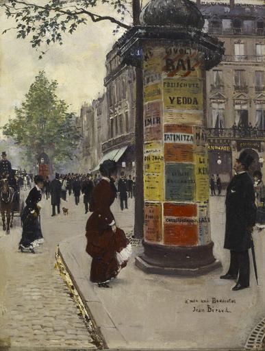 | Keywords: Jean Béraud - Paris Kiosk - Walters 371055.jpg Like a number of other 19th-century artists Béraud first trained to become a lawyer before discovering his true calling In 1872 he enrolled in the studio of the portraiture specialist Léon Bonnat While he began as a portraitist he eventually became known for his highly detailed scenes of urban life Working from a carriage that he converted into a mobile studio Béraud recorded life on the grand boulevards of Paris The corner represented here can still be recognized as the intersection of the Rue Scribe and the Boulevard des Capucines Like Degas Béraud depicted modern life in all of its variety with journalistic accuracy Béraud however delighted in recording even the smallest details which are so precise that we can make out an advertisement for Yedda a popular ballet and just below it another playbill for a comic opera called La Fatinitza which opened in Paris in 1879 between 1880 1884 Oil on canvas cm 35 5 26 5 ; with frame cm 52 71 41 91 9 21 accession number 37 1055 27564 Me Boussaton Me Boussaton Sale Georges Petit Paris May 5 1891 no 6 Maurice Mallet's Gallery June 11 1901 mode of acquisition unknown Henry Walters city Baltimore G A Lucas as agent; George A Lucas/Henry Walters account book ms Walters Art Museum Henry Walters Acquired by Henry Walters 1901 à mon ami Boussaton / Jean Béraud dedication / date lower right fr to my Boussanton / Jean Béraud Before Monet Landscape Painting in France and Impressionist Masters Highlights from The Walters Collection The Walters Art Gallery Baltimore 1998 Vive la France French Treasures from the Middle Ages to Monet The Walters Art Gallery Baltimore 1999-2000 A Magnificent Age Masterpieces from the Walters Art Museum Baltimore The Nelson-Atkins Museum of Art Kansas City; Mint Museum of Art Charlotte; The Walters Art Museum Baltimore 2002-2004 19th Century Masterpieces from the Walters Art Museum Santa Barbara Museum of Art Santa Barbara; Jack S Blanton Museum of Art Austin 2010-2011 place of origin Paris France place depicted Grand Café today Hôtel Scribe Paris PD-old-auto 1935 Paintings of Paris by Jean Béraud Paintings of Paris streets Historical images of Boulevard des Capucines 1880s Rue Scribe Paris 1880s Paintings of people in Paris French paintings in the Walters Art Museum Females with red dresses in art Fatinitza Salon indien du Grand Café 19th-century genre paintings from France Colonnes Morris in Paris Off the Wall Baltimore 1880s paintings from France 1880s dresses Mobile studios Vive la France French Treasures from the Middle Ages to Monet |