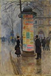 | Keywords: Jean Béraud, Parisian Street Scene.jpg Artwork Creator Jean Béraud This painting shows a view of a Parisian street corner on a gray winter day A typical Parisian scene as Beraud ™s straightforward paintings most commonly were this painting evokes bustling activity in the background and an exchange of gazes in the foreground A stylish woman dressed in black peruses a poster-covered kiosk its orange tones contrasting to the otherwise silvery tones of the painting To her right another man who momentarily appears to be doing the same actually gazes in her direction He is joined by another man who peers from behind the kiosk to admire the woman ™s fashionable beauty This woman is the only female shown in the painting as men fill the background with movement and conversation Beraud ™s representation of this street scene is so precise that its location in Paris can be identified as a view of the boulevard des Italiens from the corner of rue Laffitte c 1885 Oil panel cm 38 7 26 8 Institution Metropolitan Museum of Art exhibition history credit line Robert Lehman Collection 1975 Signed lower right Jean Béraud accession number 1975 1 243 http //www metmuseum org/collections/search-the-collections/150000227 The Metropolitan Museum of Art PD-old-auto 1935 Paintings of Paris by Jean Béraud Paintings of Paris streets Colonnes Morris in Paris Historical images of Boulevard des Italiens Rue Laffitte Paris 1885 in Paris Images of Paris from the Metropolitan Museum of Art Lehman Collection French paintings in the Metropolitan Museum of Art |
