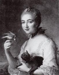| Keywords: Jean-Frédéric-Marc Nattier, Portrait de jeune femme au chat et à l'oiseau (1753).jpg Artwork creator Jean-Frédéric-Marc Nattier portrait of female 1753 Oil on canvas cm 64 5 53 5 Institution unknown object history credit line Nattier fils p x 1753 signature / date bottom left ~ full form accession number http //pics livejournal com/latiaris/pic/0002cwfz other versions PD-old-100 DEFAULTSORT 1753; unknown woman Jean-Frédéric-Marc Nattier 18th-century portrait paintings location missing 18th-century portrait paintings of unidentified women 1753 oil on canvas paintings Portrait 1753 portrait paintings from France 18th-century oil portraits of women at half length 18th-century portrait paintings with birds 18th-century portrait paintings with cats Animal bells Black and white reproductions of portrait paintings in color Eye contact in art Female hair fashion in art Females with chokers in art Portrait paintings of women of France Portrait paintings of women with birds Portrait paintings of women with cats Portraits with sky background Powdered hair in art Rococo portrait paintings of women Robe à la française Three-quarter view painted portraits of women facing left |