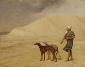 | Keywords: Jean-Léon Gérôme - On the Desert - Walters 3734.jpg Gerome was a frequent traveler first visiting the East in 1854 and returning in 1867 1869 1875 and 1881 Some of his Orientalist paintings are of documentary interest whereas others are highly romanticized This small panel commissioned by William T Walters depicts two hounds being walked by a Nubian in a barren and windy desert The trim shapes of the dogs suggest that they are Pharaoh Hounds a breed descended from the hunting dogs of ancient Egypt before 1867 oil on panel cm 21 26 8 ; Framed cm 45 1 51 4 8 3 accession number 37 34 37928 William T Walters city Baltimore from the artist Henry Walters city Baltimore Walters Art Museum Henry Walters Acquired by William T Walters 1867 Signature Lower left J L Gerome Jean-Léon Gérôme Dayton Art Institute Dayton; Minneapolis Institute of Arts Minneapolis; The Walters Art Gallery Baltimore 1972-1973 place of origin China Walters Art Museum license 2D Paintings of animals by Jean-Léon Gérôme Orientalist paintings by Jean-Léon Gérôme French paintings in the Walters Art Museum 19th-century paintings of dogs Off the Wall Baltimore |