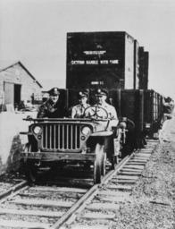 | Keywords: Jeep Switch Engine with flatbed trailer (frontal view).jpg en Jeep switch engine used by soldiers during a test run on a 1 meter narrow gauge track in Brisbane Australia on 30 June 1943 A ¼ ton jeep fitted with rail wheels can easily pull 20 000 pounds The main purpose of these rail jeeps was to haul flatcars loaded with supplies in New Guinea This demonstration was held at Eagle Farm Aerodrome in Brisbane Australia At the wheel is Brig Gen C W Connell Commanding General Air Service Command To his right are LTC Donald Thomas Boise Idaho and LTC R L Fry Pocatello Idaho Brisbane Australia 30 June 1943 See http //www team-bhp com/forum/attachments/4x4-vehicles/108924d1236364355-willys-mb-ford-gpw-meter-gauge-tracks-willysmb001 jpg www team-bhp com/ de Demonstration eines mit Eisenbahnrädern ausgerüsteten Jeeps auf einer Schmalspurbahn mit 1000 mm Spurweite im Eagle Farm Aerodrome in Brisbane Australien am 30 Juni 1943 durch amerikanische Soldaten Der 250 kg schwere Jeep auf Eisenbahnrädern konnte leicht eine Last von 10 Tonnen ziehen was für den Einsatz in Neuguinea geplant war http //www magnoliabox com/art/303104/us-army-jeep-fitted-with-flanged-wheels-pulling-a-freight-train www magnoliabox com/ Australian photographer 1943-06-30 PD-Australia thumb left Jeepomotive with flatbed trailer Willys MB / Ford GPW Australia in World War II Rail transport in Brisbane Rail Jeep Custom license marker 2015 07 14 PD-Australia |