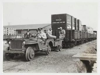 | Keywords: Jeep train in Brisbane.jpg en Jeep switch engine used by soldiers during a test run on a 1 meter narrow gauge track in Brisbane Australia on 30 June 1943 A ¼ ton jeep fitted with rail wheels can easily pull 20 000 000 pounds The main purpose of these rail jeeps was to haul flatcars loaded with supplies in New Guinea This demonstration was held at Eagle Farm Aerodrome in Brisbane Australia At the wheel is Brig Gen C W Connell Commanding General Air Service Command To his right are LTC Donald Thomas Boise Idaho and LTC R L Fry Pocatella Idaho Brisbane Australia 30 June 1943 See http //www team-bhp com/forum/attachments/4x4-vehicles/108924d1236364355-willys-mb-ford-gpw-meter-gauge-tracks-willysmb001 jpg www team-bhp com/ de Demonstration auf einer Schmalspurbahn mit 1000 mm Spurweite im Eagle Farm Aerodrome in Brisbane Australien am 30 Juni 1943 durch australische und amerikanische Soldaten Der 250 kg schwere Jeep auf Eisenbahnrädern konnte leicht eine Last von 10 Tonnen ziehen was für den Einsatz in Neuguinea geplant war 1943-06-30 http //militarymashup com/mmu_get_jpeg php 1b63e4993b49286b3154615b109c621d0 http //militarymashup com/ author other versions Custom license marker 2015 07 14 PD-Australia Uploaded with UploadWizard Rail Jeep Narrow gauge railways in Australia |