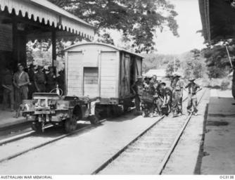 | Keywords: 'JEEPOMOTIVE' in Borneo.JPG en NORTH BORNEO 1945-08-01 LIKE THE TINY BUT POWERFUL ANT THE JEEPOMOTIVE CARRIES PUSHES OR PULLS MANY TIMES ITS OWN WEIGHT THE MAKERS SET THE HAULAGE MAXIMUM AT 1 000 POUNDS BUT JEEPOMOTIVES HAVE BEEN KNOWN TO DRAW A THREE-TON TRUCK LADEN WITH FOUR TONS OF SAND ON THIS SYSTEM SQUADRON LEADER JACK LIBERTY OF PERTH WA ADAPTED THE JEEP BY DESIGNING SPECIAL ATTACHMENT TO THE WHEELS OF JAPANESE MOTOR TRANSPORTS AND BY MODIFYING THE STANDARD JEEP AXLE TO TAKE THESE WHEELS AND TRACK THE ONE-METRE GAUGE OFFICIALLY THE AVERAGE SPEED OF THE JEEP-TRAIN HAS BEEN SET AT FIFTEEN MILES PER HOUR BUT ARMY DRIVERS ALWAYS SEEM TO RUN TO TIME IN SPITE OF ANY DELAYS ON THE ROUTE 1945-08-01 OG3138 John Thomas Harrison other versions Custom license marker 2015 07 12 PD-Australia Uploaded with UploadWizard Narrow gauge railways in Indonesia Images from the Australian War Memorial Military rail transport in World War II Rail Jeep |