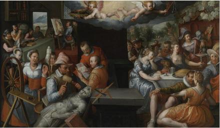 | View Original: | Jeremias van Winghe (Attr.) - The glorification of art and diligence and the punishment of gluttony and earthly pleasure.jpg (1667x971) | |||