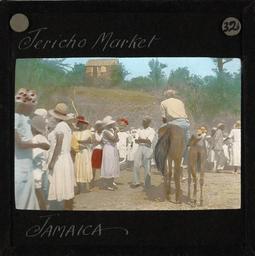 | Keywords: Jericho Market, Jamaica, ca.1875-ca.1940 (imp-cswc-GB-237-CSWC47-LS11-032).jpg en <br> Jericho Market Jamaica ca 1875-ca 1940 Photograph of Jericho Market Jamaica A group of men and women can be seen standing around talking There is also a man on a horse and a foal beside the horse A small hut can be seen on a hill in the background ; This belongs to a series of Church of Scotland Foreign Missions Committee lantern slides relating to Jamaica In 1800 the Scottish Missionary Society sent three missionaries to Jamaica Two died of yellow fever within weeks of arrival but the third became a pioneer missionary In 1824 a second venture travelled to Jamaica by invitation of local planters to instruct their slaves Scottish missionaries worked at Montego Bay in the 19th century and in 1836 the first presbytery of the Jamaican Church was constituted here Photographer Unknown Filename imp-cswc-GB-237-CSWC47-LS11-032 tif Coverage date circa 1875/1940 Part of collection International Mission Photography Archive ca 1860-ca 1960 Type images Part of subcollection Photographs from the Centre for the Study of World Christianity University of Edinburgh U K ca 1900-ca 1940s Repository name Centre for the Study of World Christianity Archival file impaunpub_Volume7/1806 url Repository address The University of Edinburgh School of Divinity New College Mound Place Edinburgh EH1 2LX United Kingdom Geographic subject country Jamaica Format aacr2 1 lantern slide 8 x 8 cm Geographic subject continent North and Central America Rights Contact the repository for details Part of series Jamaica LS11 Repository email divinity-CSWC ed ac uk Subject lcsh Keyword Marketplaces; Livestock Date created circa 1875/1940 Publisher of the digital version University of Southern California Libraries Subject aat genre exterior views Format aat lantern slides Legacy record ID impa-m69380 Access conditions http //www ed ac uk/schools-departments/divinity/research/centres/world-christianity/collections-resources File GB 237 CSWC47/LS11/32 circa 1875 /1940 author http //digitallibrary usc edu/cdm/ref/collection/p15799coll123/id/64923 PD-old-70-1923 Magic lantern images Images from USC Digital Library uploaded by Fæ International Mission Photography Archive ca 1860-ca 1960 |