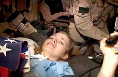 | Keywords: Jessica Lynch.jpg en 030402-D-0000X-004 Operation Iraqi Freedom -- U S Army Pfc Jessica D Lynch 19 of Palestine W Va is shown being carried aboard a coalition aircraft following her rescue from her Iraqi captors Lynch had been listed as Duty Status Whereabouts Unknown following an ambush of her convoy by enemy forces on March 23 2003 Lynch had been held at Saddam Hospital in the town of Nasiriyah Iraq a facilty used by the Iraqi regime as a military post Lynch is assigned to the 507th Ordnance Maintenance Company Fort Bliss Texas U S Army Rangers Air Force combat controllers Navy SEALs Sea Air Land and Marines participated in the rescue effort 2003 04 02 http //www navy mil/management/photodb/photos/030402-D-0000X-004 jpg DoD photo Released PD-USGov Jessica Lynch April 2003 |