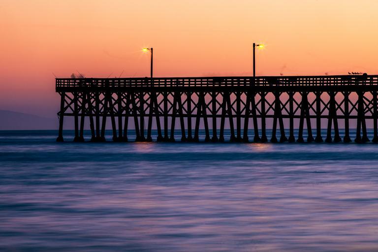 Keywords: jetty water ocean sunset sea nature pier vacation holiday peaceful scenic tranquil fishermen fishing seascape dusk dock beach lamp posts lights purple orange