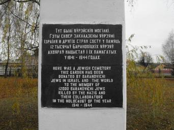 | Keywords: Jewish cemetery Baranovichi st Chernyshevskogo 2d.jpg ru Ев ейское кладбище в Ба ановичах Действовало с 1923 года до Вто ой ми овой войны Сейчас на те ито ии кладбища азбит скве в память 12 000 ба ановичских ев еев убитых нацистами 2011-11-13 own Vadim Akopyan cc-zero Uploaded with UploadWizard Jewish cemeteries in Baranavičy Holocaust memorials in Baranavičy | ||||