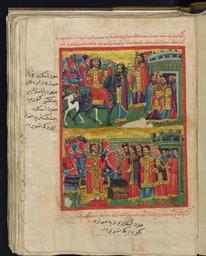 | Keywords: Jews Byzantine Greek Alexander Manuscript.JPG en A fourteenth-century miniature Greek manuscript depicting scenes from the life of Alexander the Great The priests of the Jews Rabbis offer Alexander the Great Gold and Silver Alexander spent the gifts of the Rabbi s on his Gods The whole scene is depicted entirely in Byzantine fashion of the late Byzantine period 1204-1453 Alexander the Great is depicted as a Byzantine Emperor Basileus and his troops are depicted as Byzantine-Greek soldiers of the 14th century The Jewish Rabbis are shown wearing distinctive ceremonial robes and small caps on their heads Originally written in Byzantine Greek script additional Arabic script in Turkish Language was added centuries later From the Alexander Romance in S Giorgio dei Greci in Venice he היהודי רבני היווני ש המאה הי ד el Οι ιερείς των Ιουδαίων ροσφέρουν στον Αλέξανδρο χρυσό και άργυρο Ο Αλέξανδρος αφιερώνει τα δώρα των ιερέων στους θεούς του image http //194 177 217 107/gr/showpic asp picpath 9999_min_01_92v curtable miniatures currecord 111 vorder 1 vmode miniat Miniature of the Alexander Romance a fourteenth-century book<br/> Website http //www istitutoellenico org/english/pubblicazioni/index5 html Hellenic Institute of Byzantine and Post-Byzantine Studies in Venice<br/> anonymous 1204-1453 <gallery>File Jews Byzantine Greek Alexander Manuscript cropped JPG</gallery> PD-old-100 Byzantine dress Rabbis in art Medieval miniatures of Jews Medieval European Jewish clothing Byzantine Alexander Romance Venice |