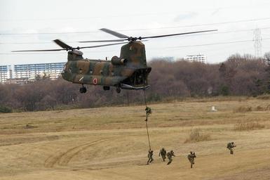 Keywords: JGSDF 1st Airborne Brigade -rapeling 20080113(Narashino).JPG Kawasaki CH-47 Camp Narashino Fast roping 1st Airborne Brigade Japan