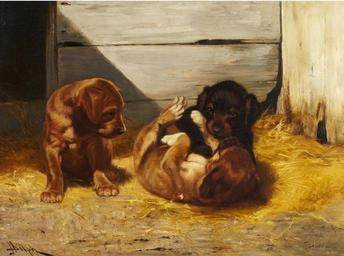 | Keywords: JH Dolph Puppies in a Barn.jpg Artwork oil on canvas Size in 18 25 24 object history exhibition history credit line accession number http //www waddingtons ca/auctions/2012/12-11-intl/ w_i_id 82405 w_item_depth 6 w_keyword Waddingtons PD-art-100 John Henry Dolph 19th-century paintings of dogs |