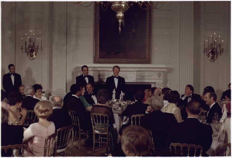 | Keywords: Jimmy Carter toasts Andre Perez President of Venezuela during a state dinner. - NARA - 175338.tif  Scope and content General notes 175338 Local identifier President 1977-1981 Carter White House Staff Photographers 01/20/1977 - 01/20/1981 Jimmy Carter Library NLJC 441 Freedom Parkway Atlanta GA 30307-1498 1977-06-28 Record group Collection JC-WHSP Carter White House Photographs Collection 01/20/1977 - 01/22/1981 Record group ARC 1120 Carter White House Photographs Presidential compiled 01/20/1977 - 01/22/1981 Series ARC 173341 File unit State Dinner for the President of Venezuela 06/28/1977 - 06/28/1977 File unit ARC 175337 Variant control numbers NAIL Control Number NLC-WHSP-C-01906-9 yes Other versions NARA-cooperation PD-USGov Carlos Andrés Pérez State dinners Jimmy Carter with national leaders Relations of the United States and Venezuela |