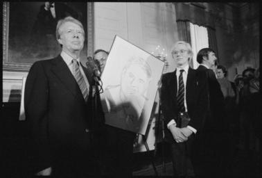 | Keywords: Jimmy Carter with Andy Warhol during a reception for inaugural portfolio artists., 06-14-1977 - NARA - 175147.jpg Local identifier President 1977-1981 Carter White House Staff Photographers 01/20/1977 - 01/20/1981 Jimmy Carter Library NLJC 441 Freedom Parkway Atlanta GA 30307-1498 1977-06-14 Record group Collection JC-WHSP Carter White House Photographs Collection 01/20/1977 - 01/22/1981 Record group ARC 1120 Carter White House Photographs Presidential compiled 01/20/1977 - 01/22/1981 Series ARC 173341 Variant control numbers NAIL Control Number NLC-WHSP-C-01726-16 General notes Scope and content File unit 3-11 Drop-By White House Conference on HIRE; 12-37 Receptionfor the Inaugural Portfolio Artists 06/14/1977 - 06/14/1977 File unit ARC 175146 Other versions <gallery> File Jimmy Carter Andy Warhol 1977 jpg JPG version File Jimmy Carter Andy Warhol 1977 png PNG version </gallery> NARA-cooperation PD-USGov Jimmy Carter Andy Warhol June 1977 in the United States |
