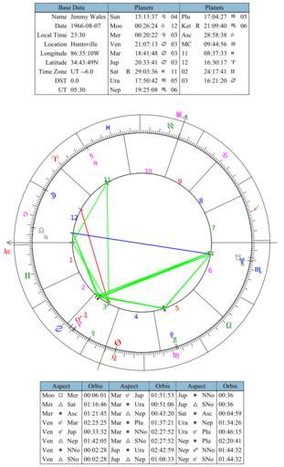| Keywords: Jimmy Wales horoscope, Maitreya 7.svg en Birth chart for Jimmy Wales The table above the natal chart shows the birth time location and the positions of the planets in the signs and houses The other table lists the aspects and their respective orbs Made with Maitreya 7 0 3 GPL and converted from PDF to SVG with Inkscape own Morn 2013-12-08 Horoscopes Natal charts Jimmy Wales in art Cc-zero | ||||