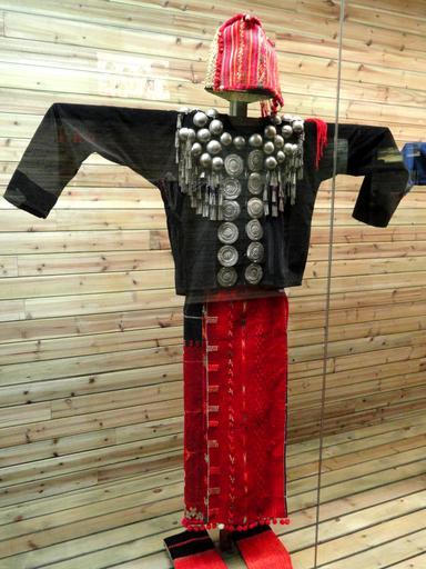 Keywords: Jingpo woman woolen, silver-ornamented clothes - Yunnan Nationalities Museum - DSC04288.JPG Jingpo woman woolen silver-ornamented clothes Clothing exhibited in the Yunnan Nationalities Museum Kunming Yunnan China I took this photograph 2011-08-13 02 23 37 Daderot Public domain Clothing in the Yunnan Nationalities Museum Jingpo clothing |